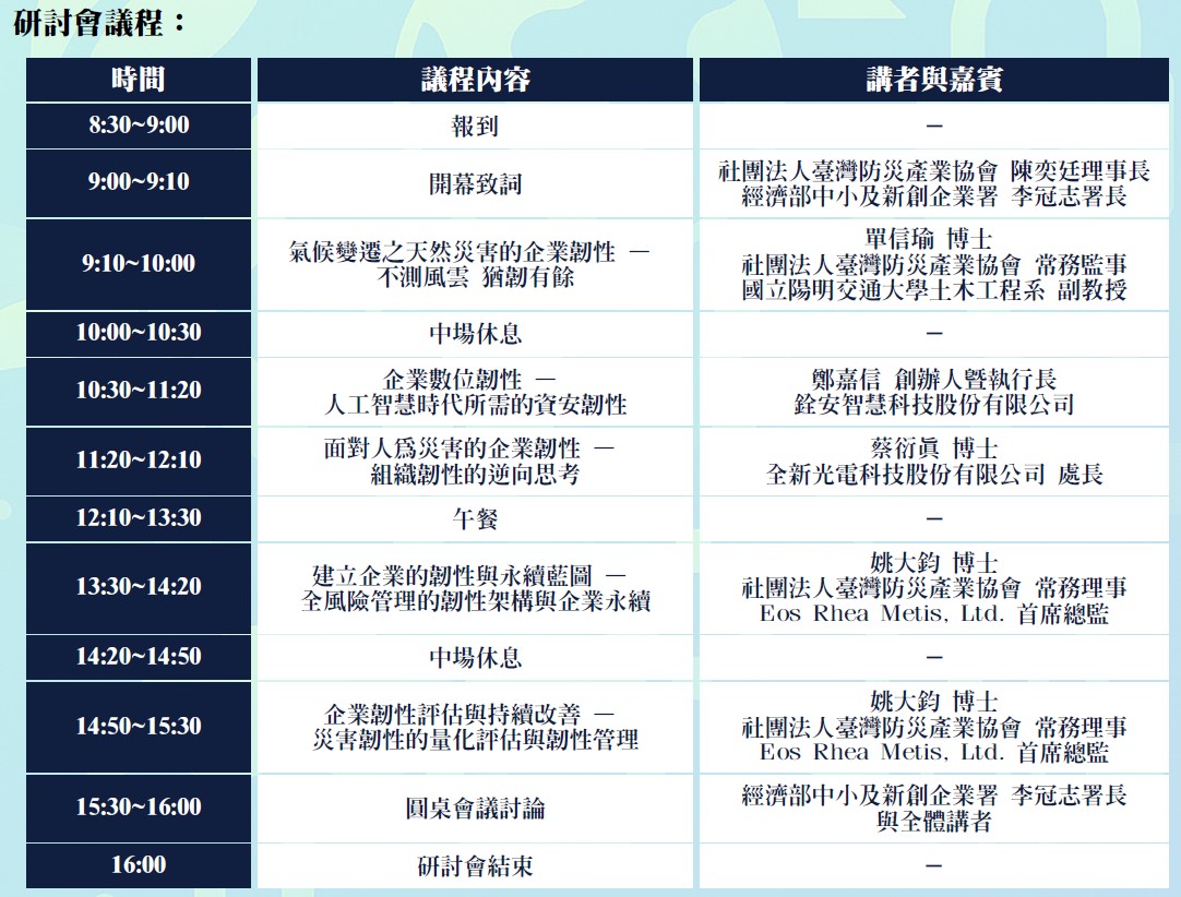 本研討會由協會主辦,邀請產官學研各界專家齊聚,分享從氣候災害、數位資安到全風險管理的最新趨勢與實務案例,協助企業打造具回復力與競爭力的永續藍圖。