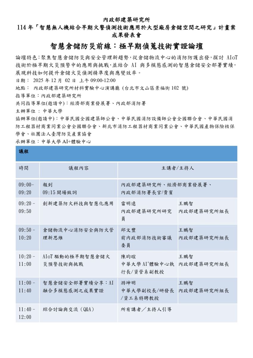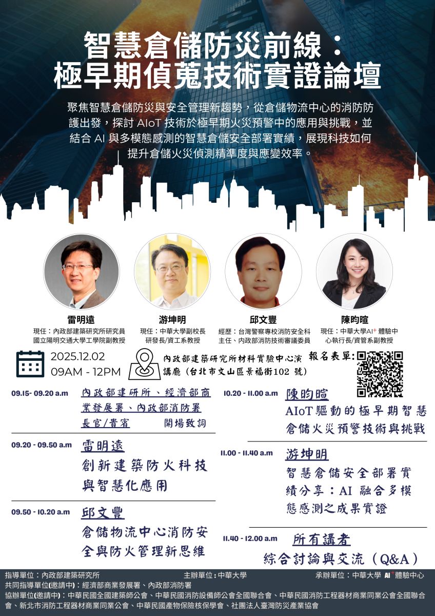 本次由 #中華大學 主辦、#內政部建築研究所 指導,並邀集產官學研重量級專家共同分享最新研究成果,聚焦 AIoT、極早期火災預警、多模態感測、智慧倉儲安全部署 等前沿技術,協助提升臺灣倉儲防災系統整體能量。協會亦受邀擔任協辦單位,共同推動智慧防災技術的實務應用。